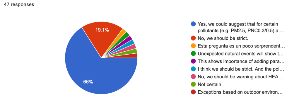 Regarding the suggestion of including exception dates for Green Building compliance during unexpected natural events like wildfires or dust storms, a significant majority (66%) of participants agreed that such exceptions could be considered for specific pollutants (e.g., PM2.5, PNC0.3/0.5) and for short durations. They viewed this as an important step for Green Building adoption. A smaller portion (19.1%) advocated for strict adherence to standards regardless of external events. Other comments presented different perspectives. Some argued that natural events expose building IAQ weaknesses and that proper recording and justification of breaches are sufficient for Green Building adoption. Others suggested that while exceptions might be viable, they should acknowledge and reward buildings with advanced filtration systems that mitigate the impact of such events. A key counterargument was that the focus should remain on warning about health risks, not simply on compliance.