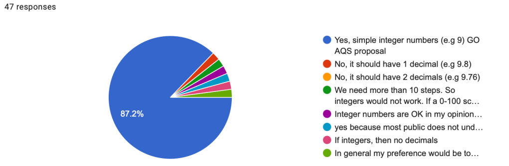 The third question, with 47 participants (n=47), revealed strong support (87.2%) for using integer numbers (e.g., 10, 9, 8, 7) in the final GO IAQS Number Score. Only two participants disagreed. While some comments acknowledged the simplicity and current functionality of integers, others suggested potential future enhancements. These included adding decimal places for higher resolution, particularly if more than 10 steps are needed, with one suggestion for a 0-100 integer scale. A key argument for using integers was their ease of understanding for the general public, especially considering global variations in decimal notation and the widespread use of the metric system.