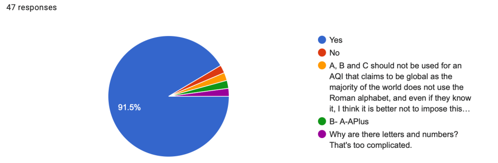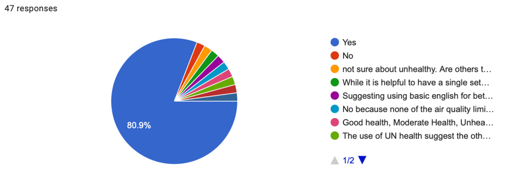The second question, with 47 participants (n=47), showed strong support for the proposed GO IAQS Number Score from 10 (Good) to 0 (Bad), with 87.2% agreeing. Only 2.1% disagreed, while other feedback focused on alternative scoring methods. Several respondents suggested reversing the scale to have 0 represent good air quality, arguing it is more intuitive. There were also calls for simplifying the scale and a suggestion to use a 0-100 scale, with 100 indicating good air quality.
