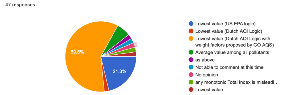 The 7th question of the questionnaire, concerning the calculation method for the Total Index, revealed divided opinions among the 47 participants (n=47). A majority (59.6%) agreed with using the lowest value, incorporating the Dutch AQI logic and the weight factors proposed by GO AQS. A smaller portion (21.3%) preferred using the lowest value based on US EPA logic. Several participants offered alternative perspectives or expressed indecision, with comments like “Not able to comment at this time” and “No opinion.” One respondent argued against any monotonic Total Index due to the hormetic dose-response curves of certain pollutants like CO and ozone, suggesting instead reporting which pollutants exceed unhealthy levels and perhaps weighting high heat and humidity separately. Another participant suggested using the average value among all pollutants.