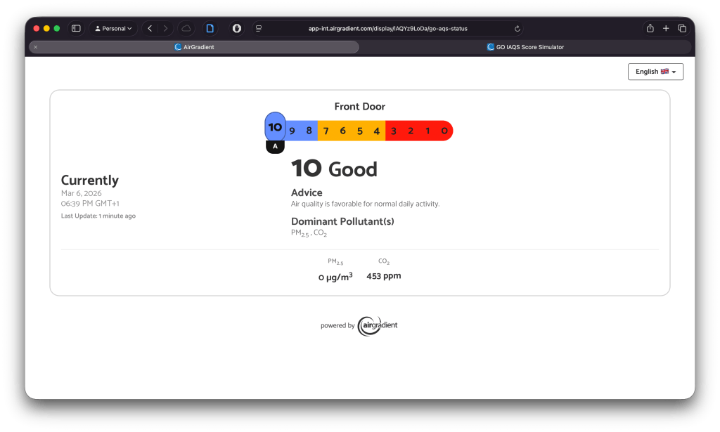 AirGradient implemented the GO IAQS methodology in two ways, (1) by providing a GO IAQS Score simulator and (2) by providing a GO IAQS Score widget.